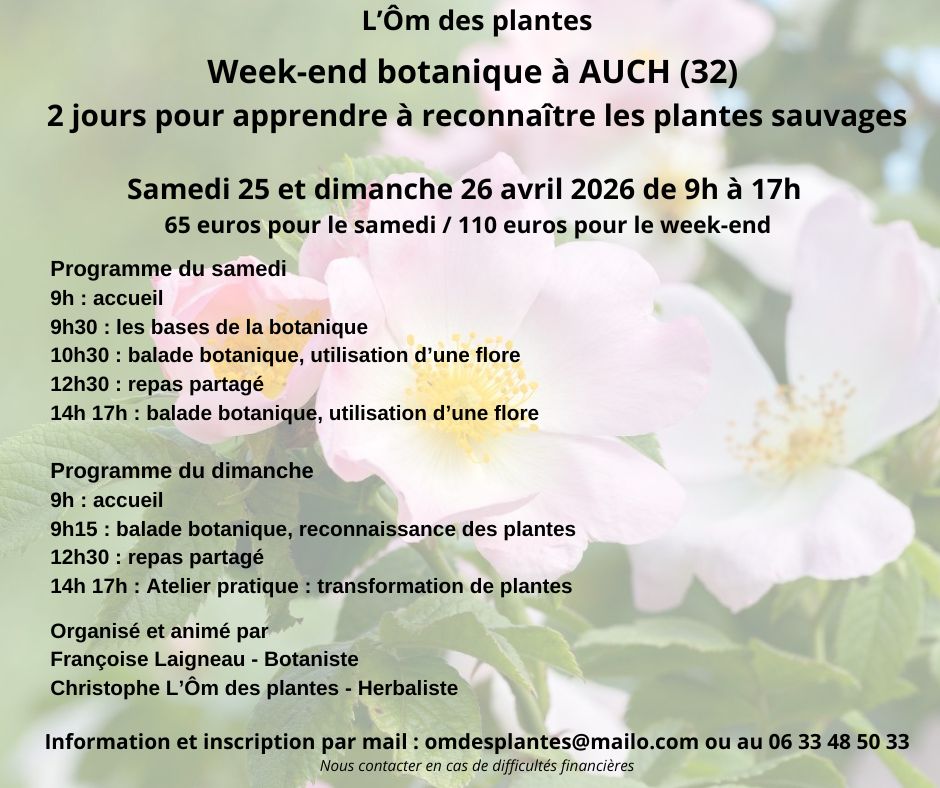 Actualités 2026 : Du 19 au 22 mars - stage de gemmothérapie avec l'Ecole Lyonnaise des Plantes médicinales, dans les Hautes-Pyrénées (65). Les 25 et 26 avril - deux journées pour apprendre à reconnaître les plantes sauvages, à Auch, organisées avec "l'Ôm des plantes", Christophe Courtot. Le samedi 30 mai - journée botanique dans le Biros, organisée avec Les Chemins occitans - Arnauld D'Heeger, accompagnateur en montagne. Du 24 au 28 août - stage axé sur l'animation par les plantes, avec l'association Education Environnement 64, en vallée d'Ossau (64). Le programme des stages et sorties pour 2026 est en préparation. N'hésitez pas à me contacter, pour toute demande particulière. ............................... A noter : La Fête des Plantes Médicinales à l'Abbaye de Bonnefont (31), aura lieu le 24 mai 2026 - programme 2026 à venir. |