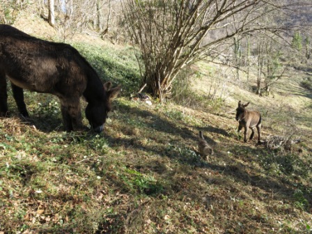 A partir de l'automne, deux ânes pâturent les parties du terrain non cultivées. |